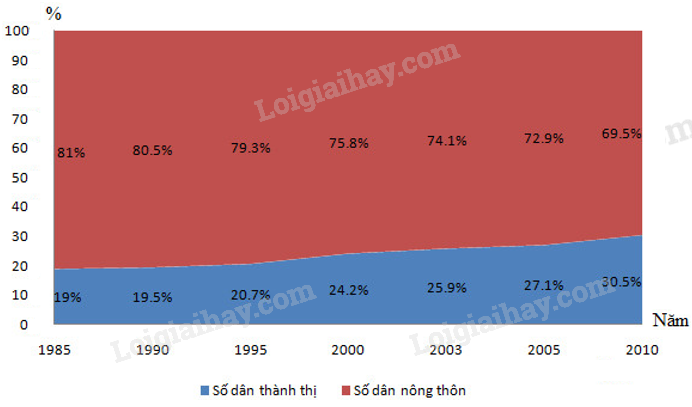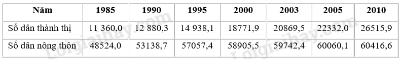 Giải câu 3 trang 72 sách bài tập Địa lí 9, Vẽ biểu đồ cơ cấu dân số phân theo thành thị và nông thôn ở nước ta, thời kì 1985 -2010