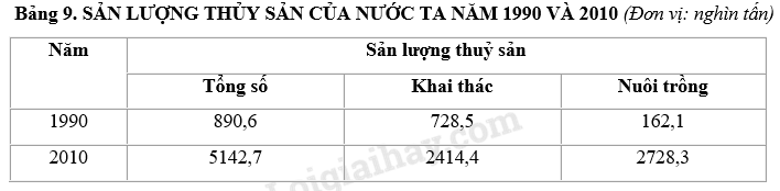 Giải câu 4 trang 27 SBT địa 9, Cho bảng 9: a) Hãy vẽ biểu đồ cột chồng thể hiện sản lượng thủy sản khai thác và nuôi trồng của nước ta năm 1990 và năm 2010. b) Nhận xét.