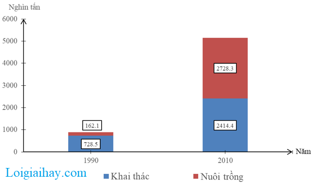 a) Hãy vẽ biểu đồ cột chồng thể hiện sản lượng thủy sản khai thác và nuôi trồng của nước ta năm 1990 và năm 2010.