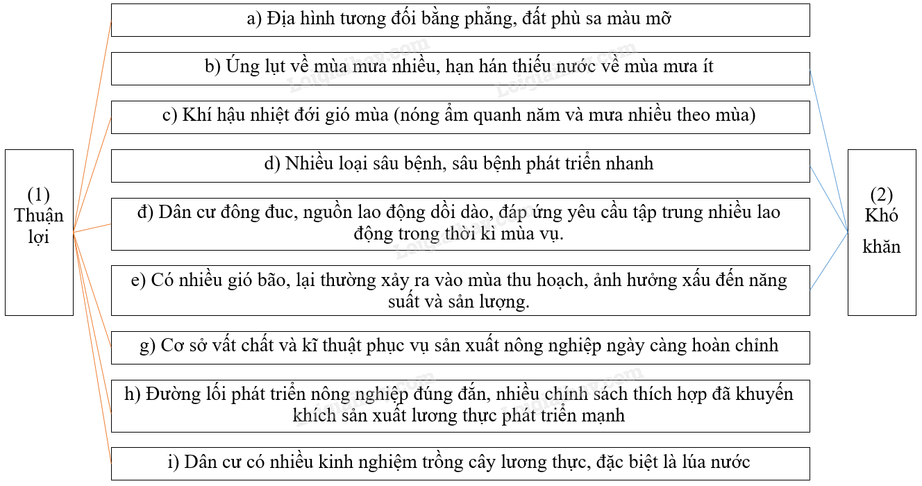 Dựa vào SGK và vốn hiểu biết của bản thân, em hãy nối ô chữ số (1) và ô chữ số (2) với những ô chữ thích hợp ở giữa để nêu rõ những thuận lợi và khó khăn trong sản xuất nông nghiệp ở Đồng bằng sông Hồng.