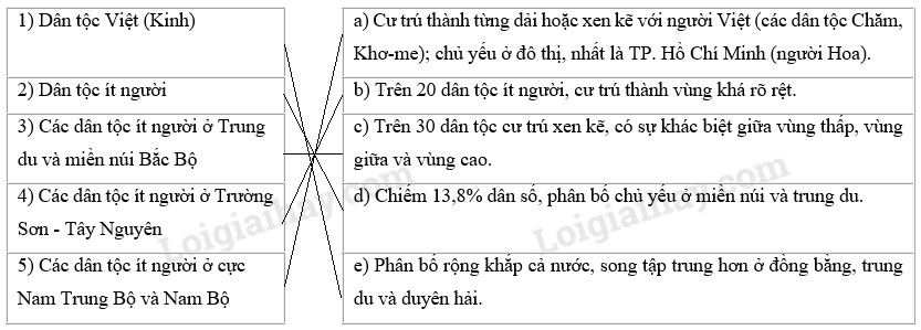 Giải câu 4 trang 7 SBT địa 9, Nối ô chữ ở bên trái với ô chữ ở bên phải sao cho phù hợp với đặc điểm phân bố các dân tộc ở Việt Nam.