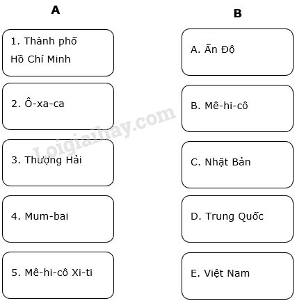 Nối tên các thành phố đông dân ở cột A với tên các quốc gia ở cột B sao cho đúng.