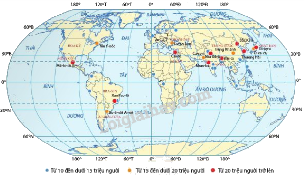 Hình 24.5. Lược đồ phân bố các thành phố lớn từ 10 triệu người trở lên trên thế giới năm 2018