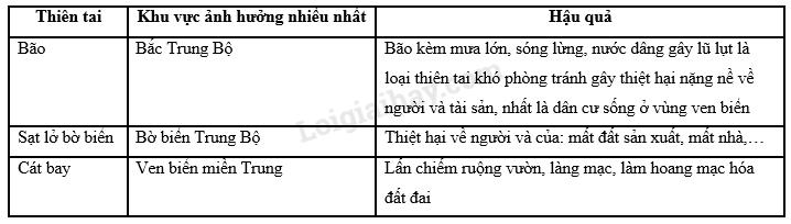 Hoàn thành bảng sau để nêu được các thiên tai thường xảy ra ở vùng biển nước ta