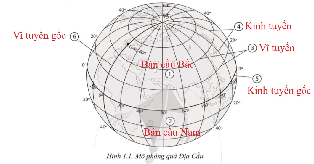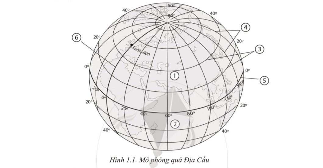 Đặt các cụm từ sau đây vào các vị trí tương ứng được đánh số trong hình 1.1 sao cho đúng: bán cầu Bắc, kinh tuyến, vĩ tuyến, kinh tuyến gốc, vĩ tuyến gốc, bán cầu Nam.