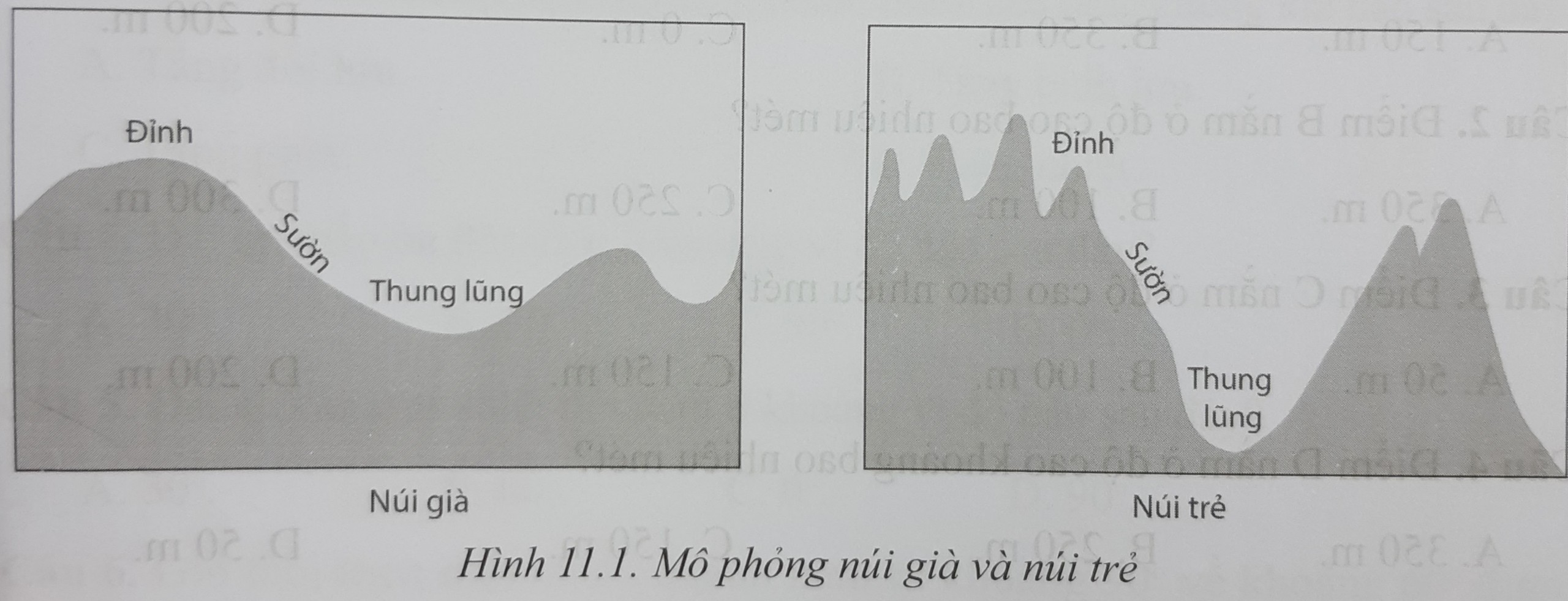 Quan sát hình sau: Hãy cho biết núi già và núi trẻ khác nhau ở những điểm nào.