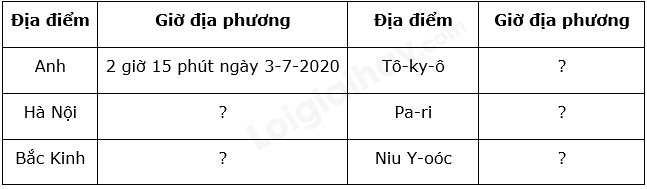 Hãy lập bảng thời gian để các bạn ở Hà Nội (Việt Nam), Bắc Kinh (Trung Quốc), Tô-ky-ô (Nhật Bản), Pa-ri (Pháp) và Niu Y-oóc (Hoa Kỳ) có thể biết được để xem (tính theo giờ địa phương) trận bóng này theo mẫu sau: