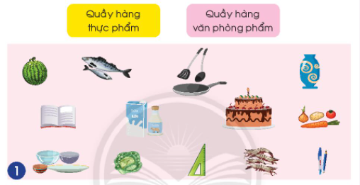 Em quan sát các loại hàng hóa trong hình 1 và xếp vào 2 quầy hàng.