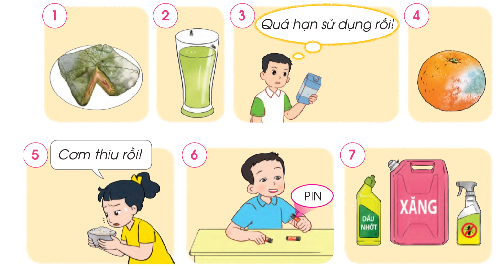 Hãy nói thức ăn, đồ uống và đồ dùng có thể gây ngộ độc qua đường ăn uống trong các hình sau đây.