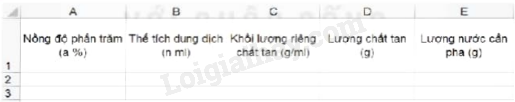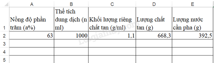 Bước 3: Sử dụng công thức nghiệm ở HĐ 1 để nhập công thức vào cột chất tan và lượng nước cần pha.