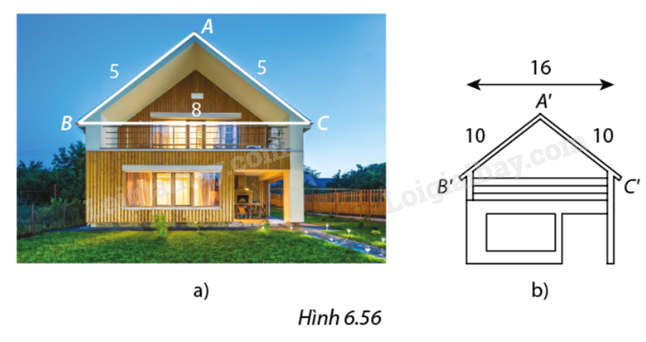 Trên bản vẽ thiết kế mặt tiền ngôi nhà ở Hình 5.65b, khoảng cách thực tế giữa các đỉnh \(A’,B’,C’\) của mái nhà là \(A’B’ = A’C’ = 10\,cm,B’C’ = 16\,cm.\) Trên thực tế, mái nhà được xây dựng có kích thước \(AB = AC = 5\,m\) và \(BC = 8\,m\) (Hình 5.56a). Hỏi mặt tiền của mái nhà có được xây dựng đúng với hình dạng như được thiết kế không?