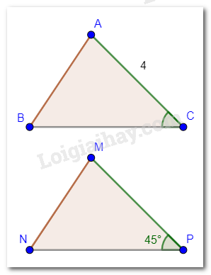 Cho biết \(\Delta ABC = \Delta MNP\), \(AC = 4\)cm, \(\widehat {MPN} = 45^\circ \). Tính độ dài cạnh MP và số đo góc ACB.