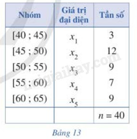 Xét mẫu số liệu ghép nhóm cho bởi bảng 13 a) Tìm \({x_1},{x_2},{x_3},{x_4},{x_5}\) lần lượt là giá trị đại diện của nhóm 1, nhóm 2, nhóm 3, nhóm 4, nhóm 5 b) Tính số trung bình cộng \(\overline x \) của mẫu số liệu ghép nhóm đó c) Tính \({s^2} = \frac{{3.{{({x_1} – \overline x )}^2} + 12{{({x_2} – \overline x )}^2} + 9{{({x_3} – \overline x )}^2} + 7{{({x_4} – \overline x )}^2} + 9{{({x_5} – \overline x )}^2}}}{{40}}\) d) Tính \(s = \sqrt {{s^2}} \)