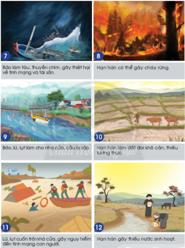 Em đọc thông tin bên dưới các hình 7 – 12 tìm những rủi ro, thiệt hại do hạn hán, lũ, lụt gây ra và chia sẻ với bạn.