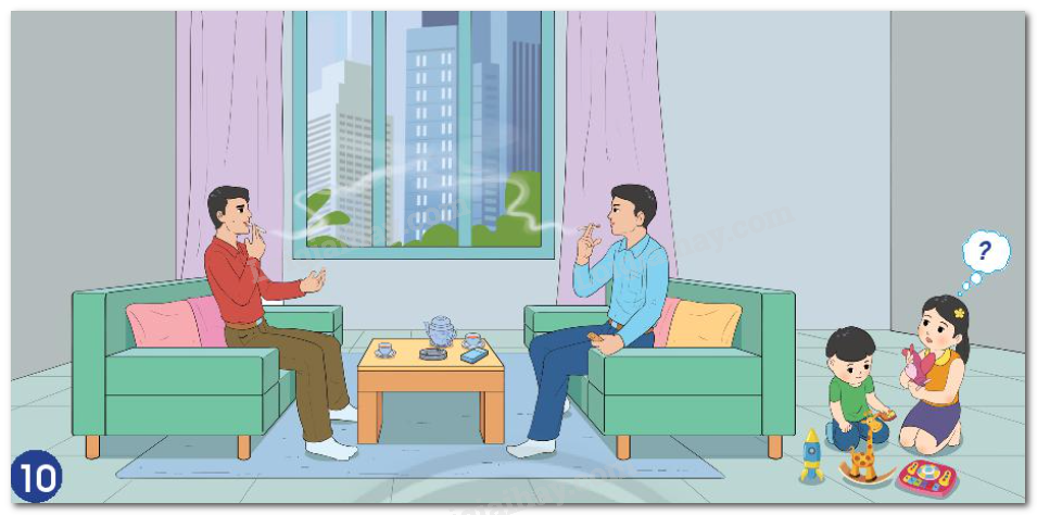 – Tình huống: Em và em trai đang chơi, bố và một vị khách hút thuốc lá làm khói lan ra trong không khí.