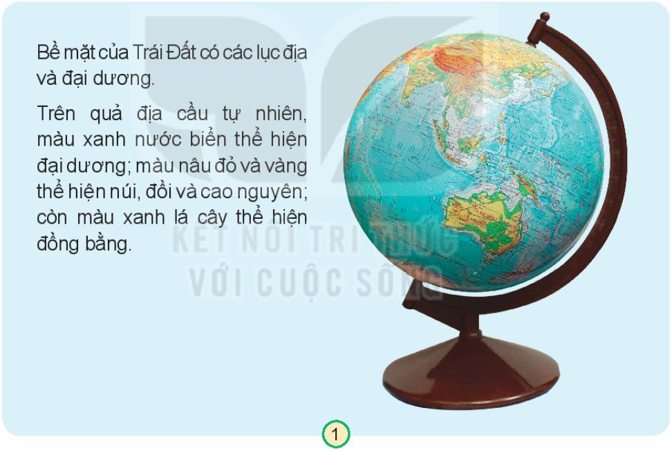 1. Trên quả địa cầu, màu xanh nước biển thể hiện đại dương; màu nâu đỏ và vàng thể hiện núi, đồi và cao nguyên; còn màu xanh lá cây thể hiện đồng bằng. Đại dương chiếm phần lớn diện tích bề mặt Trái Đất. Lục địa là phần đất liền rộng lớn được bao bọc bởi đại dương.