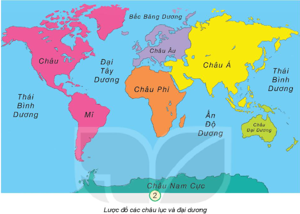 2. Các châu lục là: Châu Mĩ, châu Phi, châu Âu, châu Á, châu Đại Dương, châu Nam Cực.