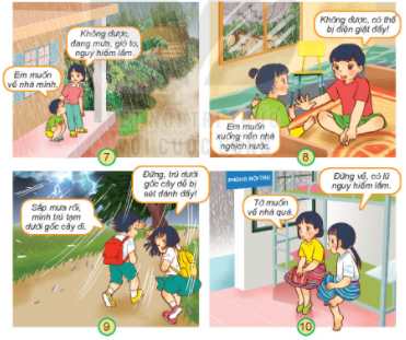 => Khi giông sét xảy ra, bạn nữ nói trú dưới gốc cây là sai vì rất dễ bị sét đánh nên bạn nữ còn lại khuyên không trú dưới gốc cây là đúng.