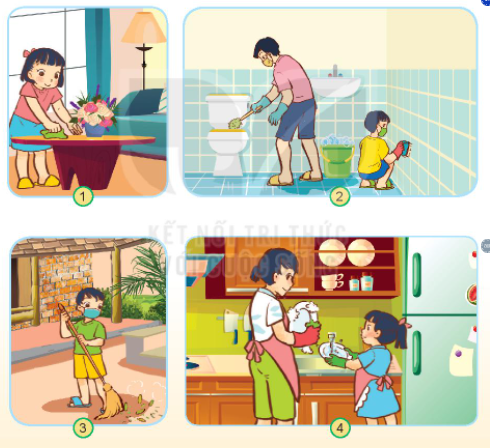 – Tranh 2: Bạn nhỏ đang cùng bố cọ rửa nhà vệ sinh.