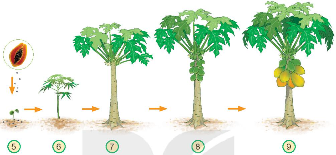 1. Quan sát từ hình 5 đến hình 9 và mô tả quá trình phát triển của cây đu đủ.