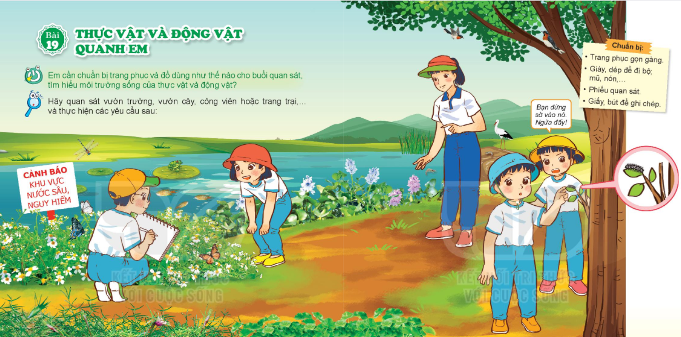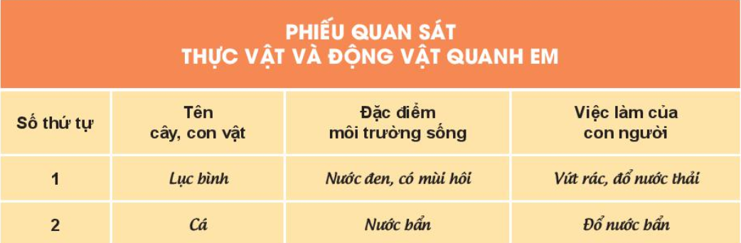 Hãy quan sát vườn trường, vườn cây, công viên hoặc trang trại,… và thực hiện các yêu cầu sau: 1. Tìm kiếm các cây và con vật sống ở khu vực đó. 2. Mô tả môi trường sống của thực vật và động vật nơi em quan sát. 3. Tìm hiểu việc làm của con người làm cho môi trường sống của thực vật và động vật ở đó thay đổi. 4. Hoàn thành phiếu quan sát theo gợi ý sau: