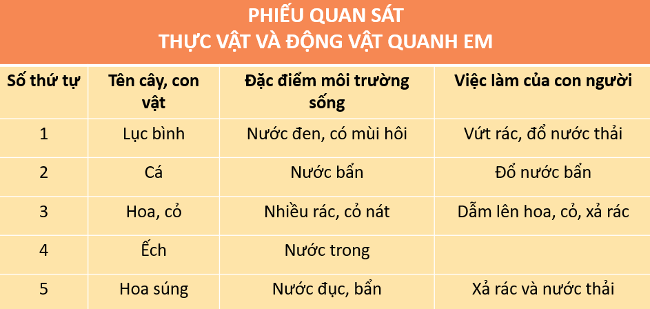 4. Hoàn thành phiếu quan sát theo gợi ý sau: