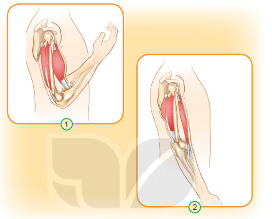 1. Làm động tác co và duỗi tay như hình vẽ. Theo dõi sự thay đổi của các cơ cánh tay kết hợp với quan sát các hình dưới đây và cho biết: