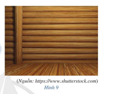 Trong Hình 9, cột gỗ thẳng đứng và sàn nhà nằm ngang gợi nên hình ảnh đường thẳng vuông góc với mặt phẳng.