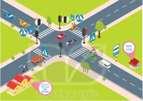 – Hoa đi ra khỏi nhà, đi đến ngã tư. Ở ngã tư, Hoa cần chú ý đèn giao thông, khi đèn xanh cho người đi bộ, Hoa sang đường ở vạch kẻ dành cho người đi bộ. Hoa đi thẳng vỉa hè đó và nhìn hướng tay trái là đến trường.