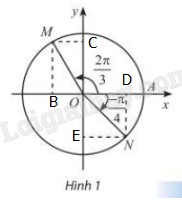 Trong Hình 1, M và N là điểm biểu diễn của các góc lượng giác \(\frac{{2\pi }}{3}\) và \(\frac{\pi }{4}\) trên