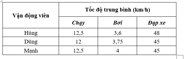 Ba vận động viên Hùng, Dũng và Mạnh tham gia thi đấu nội dung ba môn phối hợp: chạy, bơi và đạp xe, trong đó tốc độ trung bình của họ trên mỗi chặng đua được cho ở bảng dưới đây.