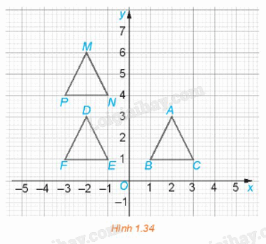 Từ Hình 1.34, ta thấy: \(A\left( {2;{\rm{ }}3} \right),{\rm{ }}B\left( {1;{\rm{ }}1} \right),{\rm{ }}C\left( {3;{\rm{ }}1} \right),{\rm{ }}D\left( {-{\rm{ }}2;{\rm{ }}3} \right),{\rm{ }}E\left( {-{\rm{ }}1;{\rm{ }}1} \right),{\rm{ }}F\left( {-{\rm{ }}3;{\rm{ }}1} \right),{\rm{ }}M\left( {-{\rm{ }}2;{\rm{ }}6} \right),{\rm{ }}N\left( {-{\rm{ }}1;{\rm{ }}4} \right),{\rm{ }}P\left( {-{\rm{ }}3;{\rm{ }}4} \right).\)