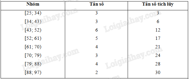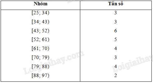 Lập bảng tần số ghép nhóm có tám nhóm ứng với tám nửa khoảng sau: [25; 34); [34; 43); [43; 52); [52; 61); [61; 70); [70; 79); [79; 88); [88; 97)