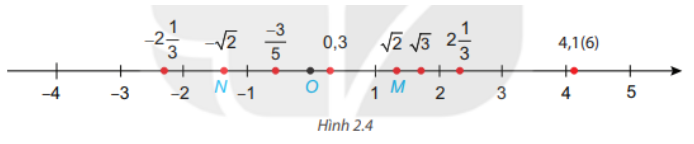 Điểm nào trong Hình 2.4 biểu diễn số \( – \sqrt 2 \)? Em có nhận xét gì về điểm biểu diễn của hai số đối nhau?