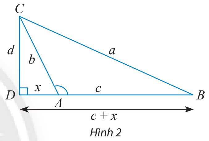 Xét tam giác vuông BCD, ta có: \({a^2} = {d^2} + {(c – x)^2} = {d^2} + {x^2} + {c^2} – 2xc\)    (1)