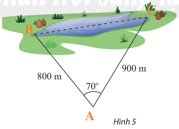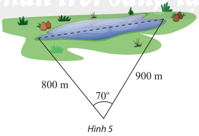 Tính khoảng cách giữa hai điểm ở hai đầu của một hồ nước. Biết từ một điểm cách hai đầu hồ lần lượt là 880 m và 900 m người quan sát nhìn hai điểm này dưới một góc 70 (Hình 5).