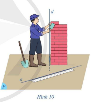 Hình 10 mô tả một người thợ xây đang thả dây dọi vuông góc với nền nhà. Coi dây dọi như đường thẳng và nền nhà như mặt phẳng (P), khi đó Hình 10 gợi nên hình ảnh đường thẳng d vuông góc với mặt phẳng (P). Người thợ xây đặt chiếc thước thẳng ở một vị trí tùy ý trên nền nhà. Coi chiếc thước thẳng đó là đường thẳng a trong mặt phẳng (P), nêu dự đoán về mối liên hệ giữa đường thẳng d và đường thẳng a.