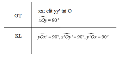 Cho định lí: “ Nếu hai đường thẳng xx’ và yy’ cắt nhau tại O và góc xOy vuông
