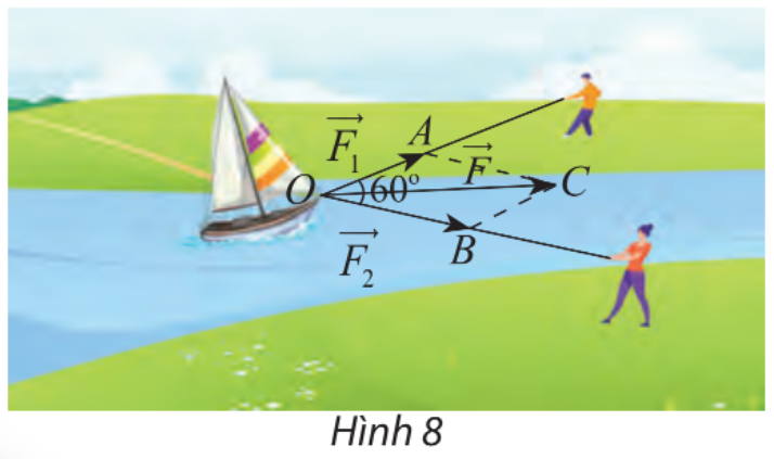 Hai người cùng kéo một con thuyền với hai lực \(\overrightarrow {{F_1}}  = \overrightarrow {OA} ,\overrightarrow {{F_2}}  = \overrightarrow {OB} \) có độ lớn lần lượt là 400 N, 600 N (hình 8). Cho biết góc giữa hai vectơ là \({60^\circ }\). Tìm độ lớn của vectơ hợp lực \(\overrightarrow F \) là tổng của hai lực \(\overrightarrow {{F_1}} \) và \(\overrightarrow {{F_2}} \)
