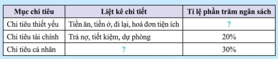 • Tỉ lệ phần trăm ngân sách của tiền ăn, tiền ở, đi lại, hóa đơn tiện ích (cho chi tiêu thiết yếu) chiếm 50%;