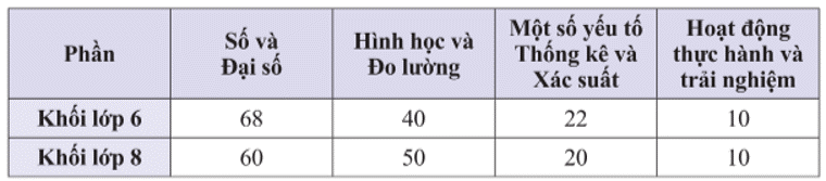 Cho bảng thống kê số tiết học các nội dung trong môn Toán của hai khối lớp 6 và lớp 8 như sau: