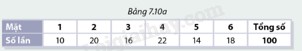 b) Bảng 7.10a ghi lại kết quả mà Đào thu được trong \(100\) lần gieo xúc xắc.