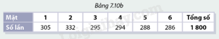 c) Bảng 7.10b ghi lại kết quả mà \(9\) bạn trong tổ của Lan thu được sau \(1800\) lần gieo xúc xắc (mỗi bạn gieo \(200\) lần, ghi lại kết quả, sau đó tổng hợp dữ liệu trong Bảng 7.10b).