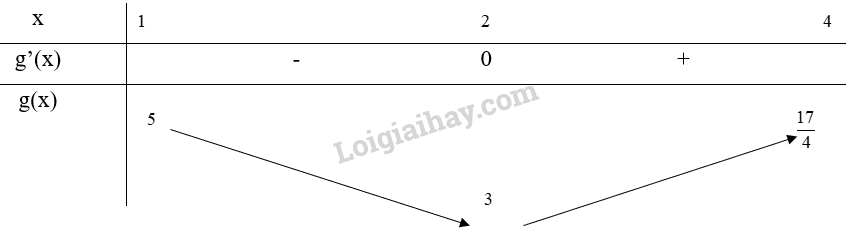 Từ bảng biến thiên, ta thấy \(\mathop {\min }\limits_{[1;4]} g(x) = g(2) = 3\) và \(\mathop {\max }\limits_{[1;4]} g(x) = g(1) = 5\)