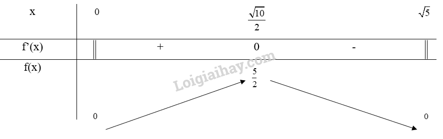 \(f'(x) = 0 \Leftrightarrow \left[ \begin{array}{l}x = \frac{{\sqrt {10} }}{2}\\x =  – \frac{{\sqrt {10} }}{2}(loai)\end{array} \right.\)