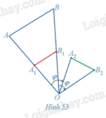 Theo chiều quay cùng chiều kim đồng hồ, dựng góc \(\widehat {{A_1}O{A_2}} = 60^\circ \) sao cho \(O{A_1}\; = {\rm{ }}O{A_2}\); dựng góc \(\widehat {{B_1}O{B_2}} = 60^\circ \) sao cho \(O{B_1}\; = {\rm{ }}O{B_2}\). Khi đó ta có A2, B2 tương ứng là ảnh của A1, B1 qua phép quay tâm O với góc quay \(\varphi  = -60^\circ \) nên đoạn thẳng \({A_2}{B_2}\)  là ảnh của đoạn thẳng A1B1 qua phép quay tâm O với góc quay \(\varphi  = -60^\circ \).