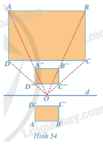 c) Phép đồng dạng có được bằng cách thực hiện liên tiếp phép vị tự tâm O tỉ số k với \(k = \frac{{OA”}}{{OA}}\)  và phép đối xứng trục d (\({V_{(O,{\rm{ }}k)}}\) trước,  sau) biến hình chữ nhật ABCD thành hình chữ nhật A’B’C’D’.