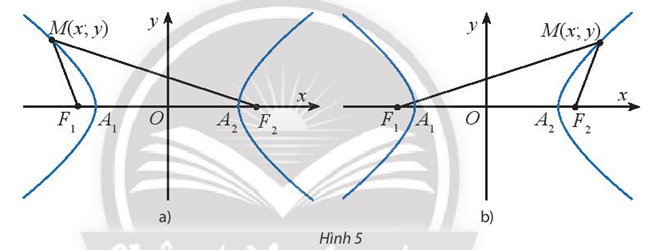 b) Giả sử điểm \(M(x;y)\) thuộc nhánh đi qua \({A_1}( – a;0)\) (Hình 5a). Sử dụng kết quả đã chứng minh được ở câu a) kết hợp với tính chất \(M{F_2} – M{F_1} = 2a\) đã biết để chứng minh \(M{F_2} + M{F_1} =  – 2\frac{{cx}}{a}\). Từ đó, chứng minh các công thức: \(M{F_1} =  – a – \frac{c}{a}{x_0};M{F_2} = a – \frac{c}{a}{x_0}\)