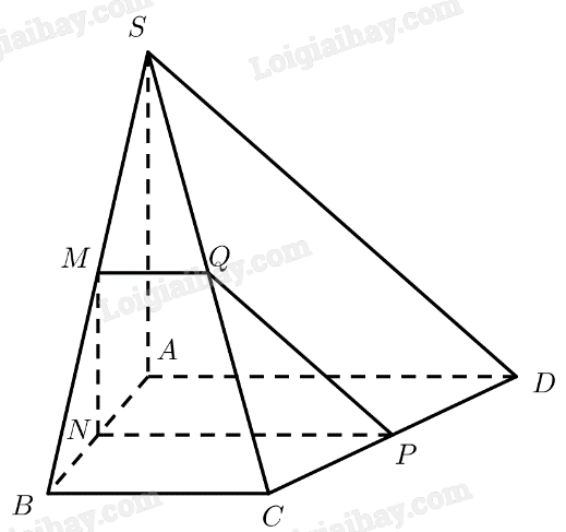 Cho hình chóp \(S.ABCD\) có đáy \(ABCD\) là hình thang vuông với \(AB\) là cạnh góc vuông và có cạnh \(SA\) vuông góc với mặt phẳng \(\left( {ABCD} \right)\). Cho \(M,N,P,Q\) lần lượt là trung điểm của \(SB,AB,CD,SC\). Chứng minh rằng: