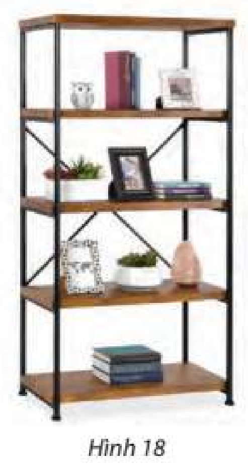 Một kệ sách có bốn trụ chống và các ngăn làm bằng các tấm gỗ (Hình 18). Làm thể nào dùng một êke để kiểm tra xem các tấm gỗ có vuông góc với mỗi trụ chống và song song với nhau hay không? Giải thích cách làm.